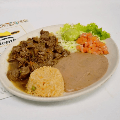 Tender beef tips cooked in Mexican sauce. Served with guacamole, lettuce, tomatoes & tortillas