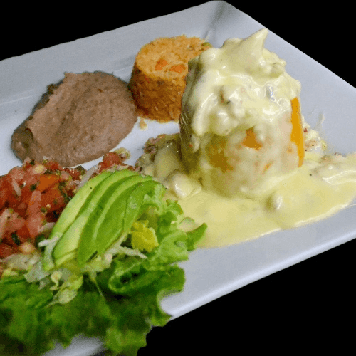 Stuffed bell pepper with crab meat, shrimp, crawfish, onions, mushrooms & bread crumbs topped with cheese. Served with rice, refried beans, avocado & pico de gallo