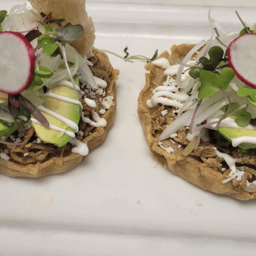 Two fried masa base topped with carnitas sauteed in tomatillo sauce, refried beans, queso fresco, cream, avocado, lime pickled onions