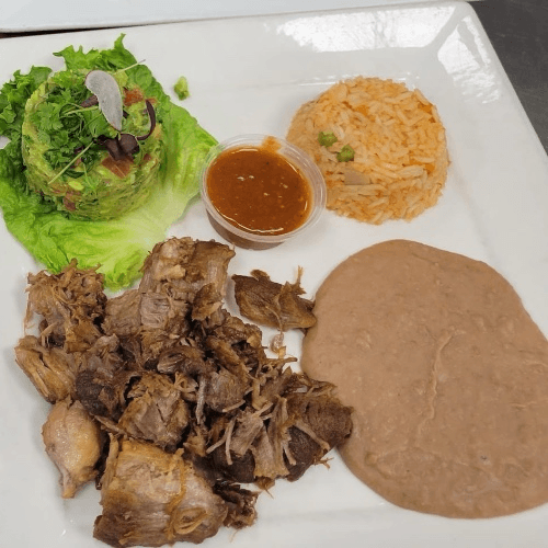 A traditional recipe from Merida, Yucatan Mexico. Pork shank marinated in our secret spice mix & slow roasted for 10 hours. Served with refried black beans, cilantro rice & "Curtido" pickled onions & habanero slices