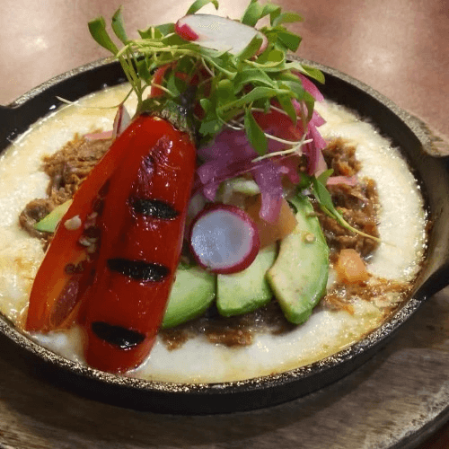 Our delicious birria in a queso fundido topped with "Curtido", avocado, microgreens and a chile toreado
