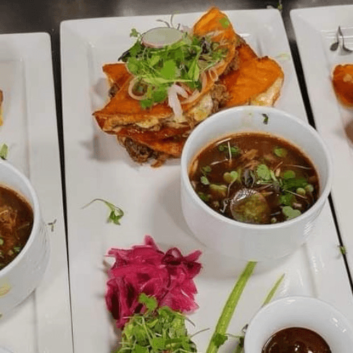 3 seasoned corn tortillas stuffed with cheese and our delicious birria. Served with a bowl of the savory "Consommé" broth, Mexican guacamole, "Curtido" and our new special salsas, "Salsa morita"- a black dried pepper which has a smoky flavor to it & "Salsa de tomate"-a new spin to the traditional tomato salsa with a extra kick of heat