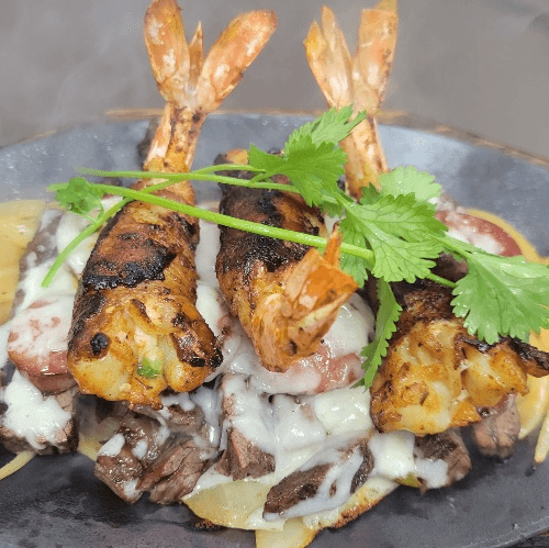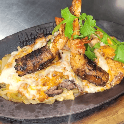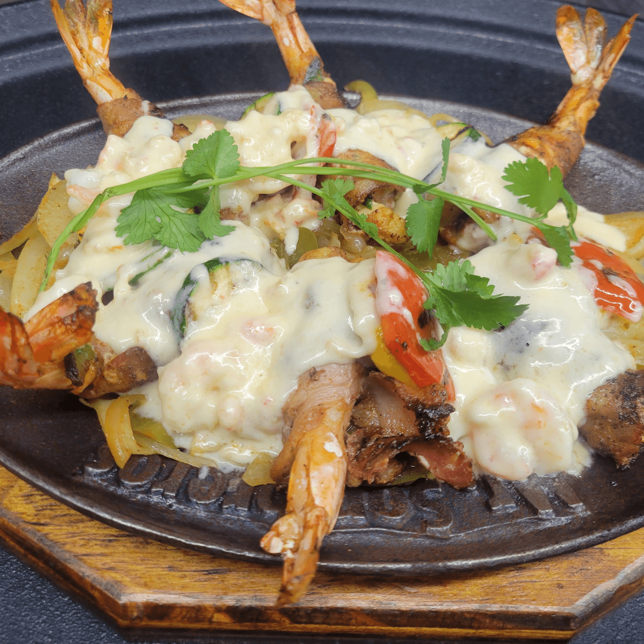 Beef, chicken or mix fajitas topped with smoked sausage, Monterrey jack cheese & 3 shrimp diablos