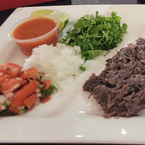 Two corn tortillas filled with our home-made barbacoa, topped with spicy sauce, white cheese, onions, cilantro & sliced avocado