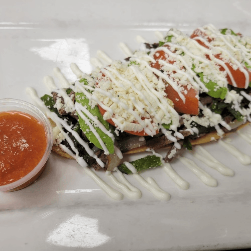 Grilled masa (corn dough) shaped like a sandal, topped with refried black beans, steak sauteed with onions and poblano peppers, tomato, avocado, sour cream, queso fresco and habanero salsa on the side