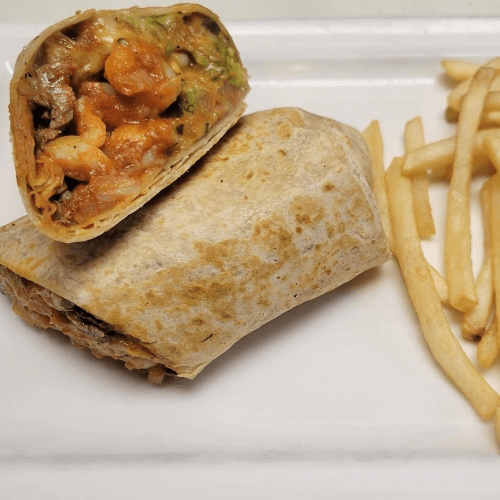 One large flour tortilla filled with ground beef, rice, refried beans & topped with chile con queso. Served with guacamole, sour cream, lettuce, tomatoes, rice & refried beans