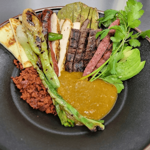 Carne asada, chorizo, grilled chicken, jalapeño sausage, grilled queso fresco, onions & cactus. Served in a hot sauce