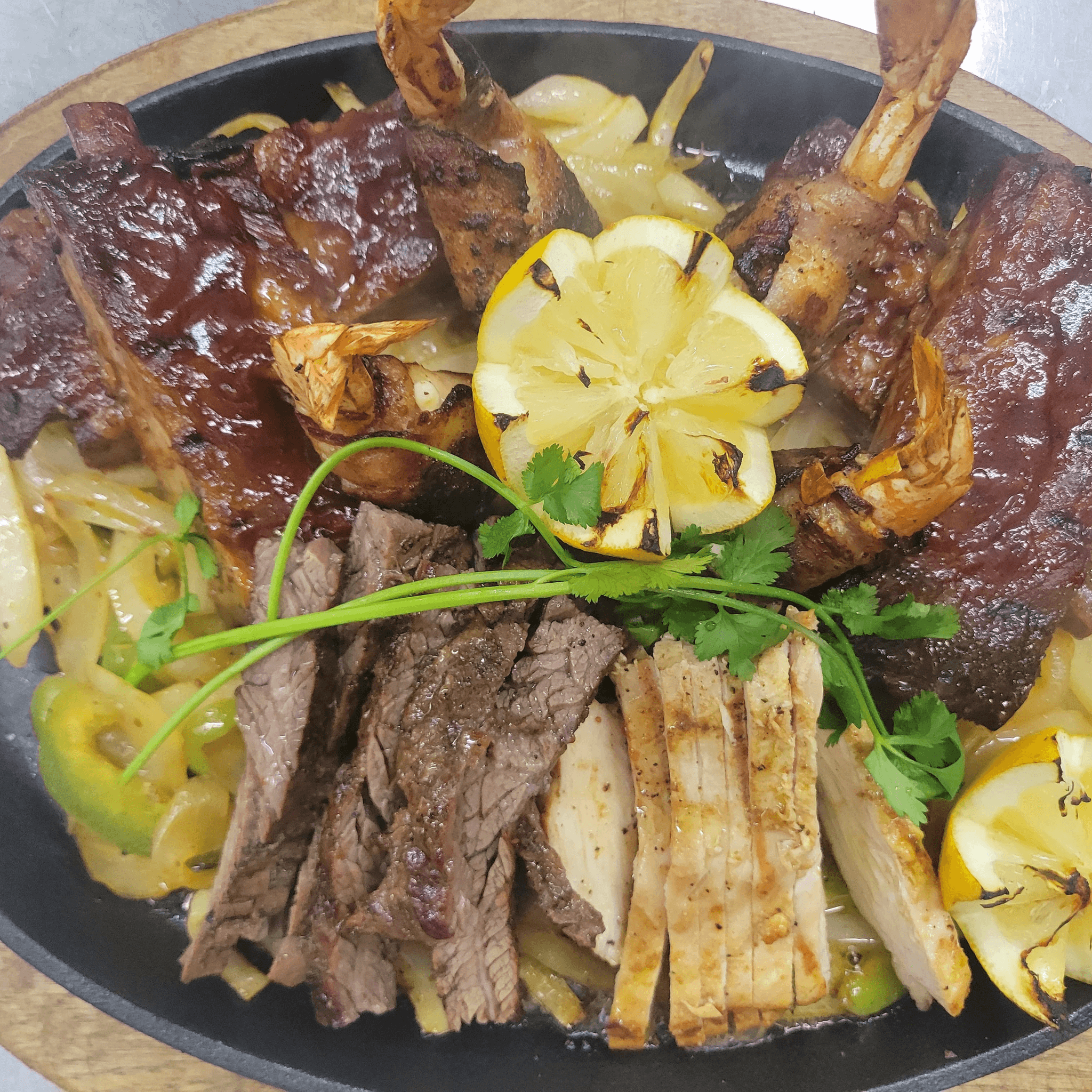 For two people. Beef & chicken fajitas, baby back ribs, 4 shrimp diablos