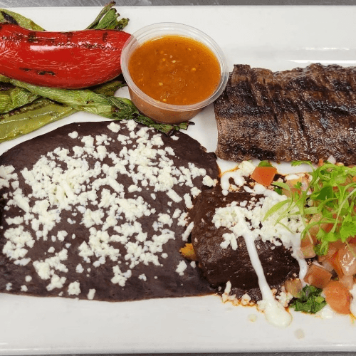 Skirt steak, cactus, onions & avocado salad. Shredded chicken mole enchilada topped with cream, pico de gallo, queso fresco, herbs, toreado & black refried beans