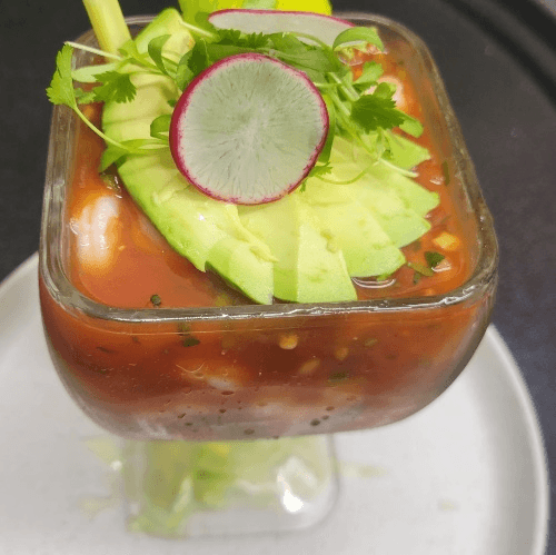 Shrimp cocktail in a mild hot sauce with avocado, tomatoes, onions & cilantro