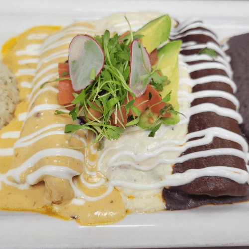 Mole Shredded chicken enchilada, cream Shredded chicken enchilada, creamy chipotle shrimp enchilada. Black refried beans, pico de gallo, avocado, sour cream, cilantro rice & herbs