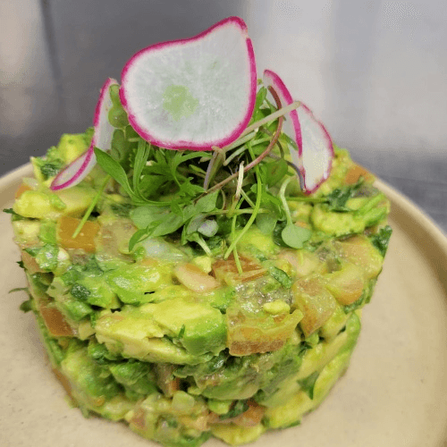 Our freshly made guacamole set atop a bed of lettuce & topped with tomato